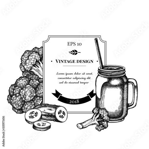 Badge design with black and white broccoli, smothie jars, cucumber