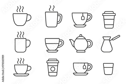 Coffee and tea thin line icon set. Hot beverage concepts with cup, mug, teapot, cezve and takeaway paper cup. Vector pack with editable stroke for web and app design.