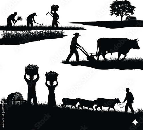 Traditional farming silhouette vector illustration, rural agriculture, ox ploughing, farmers harvesting crops, village lifestyle, countryside farming, manual labor scenes.