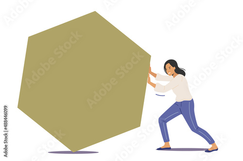 Businesswoman pushing boulder uphill vector concept of Sisyphus. Symbol of hard work, futile effort, strength, struggle, challenge but also motivation and ambition.