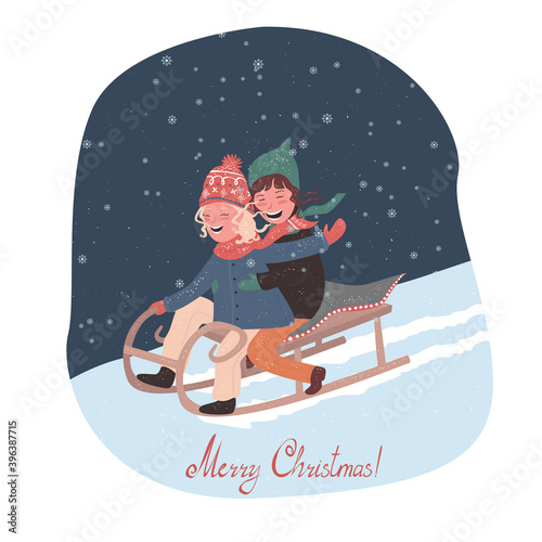 Kids riding on sleds vector flat illustration. Happy children sledding on sleds. Snowy landscape, winter forest. Boy and girl having fun, sledding downhill during winter. Winter outdoor activity.