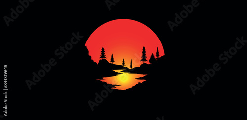 Wallpaper vektor Pemandangan dengan siluet dua pohon di tepi sungai, dan cahaya bulan di malam hari