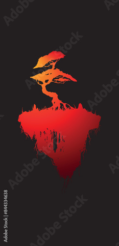 Wallpaper vektor lanskap dengan siluet gua yang diterangi cahaya bulan, dua pohon, akar pohon, cahaya bulan