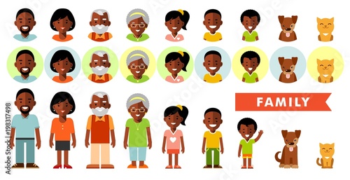 Happy big African family together. Fun grandparents, parents and children. Mother, father, grandmother, grandfather, daughter and son are standing and smiling. Isolated vector illustration