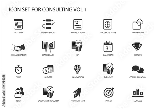 Vector icon set for topic consulting. Various symbols for strategy consulting, IT consulting, business consulting and management consulting
