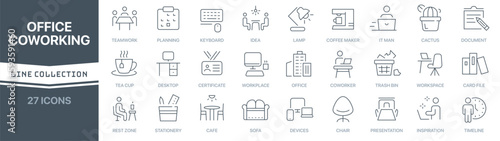 Office workspace set of web icons in line style. Office and coworking icons for web and mobile app. Office, remote working, meeting, co-worker, workspace, desk, computer, business icons and more