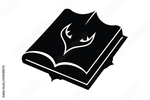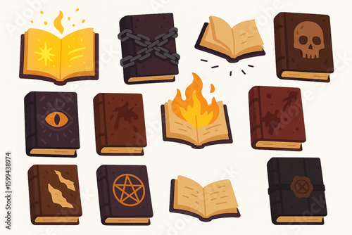 Forbidden Book Icons. Solid, filled icons set of cursed and forbidden books: black flames, cracked seal,