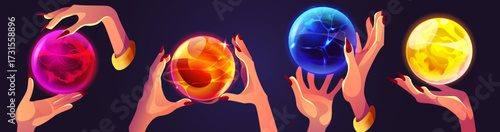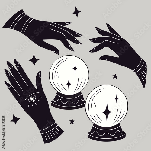 Mystical elements set: crystal ball, magic book, tarot hands, deck of cards, psychic icon collection