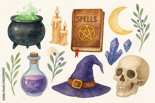 Collection of enchanted magical objects and mystical symbols