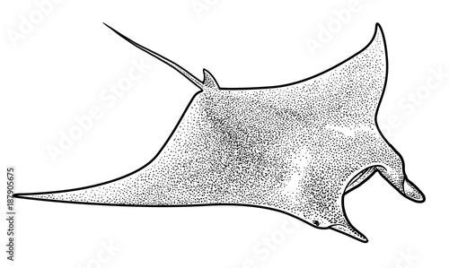 Manta ray illustration, drawing, engraving, ink, line art, vector