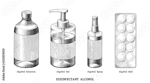 Disinfectant alcohol set hand draw vintage style black and white clip art isolated on white background