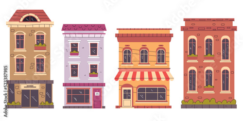 Set colorful country town houses with roof, suburban cottages, guest house, mansion, townhouse, house brick, buildings. Facade apartment house. Real Estate vector illustration