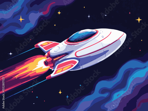 A rocket taking off with a vibrant space backdrop filled with stars, illustrating the journey into the unknown universe..eps