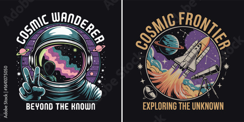Cosmic Wanderer and Cosmic Frontier space exploration illustrations with astronaut and rocket for sci fi t shirt design