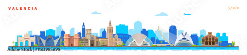 Valencia city skyline landmarks abstract colorful banner design, Spain.