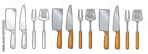 Set BBQ utensils. Spatula, fork, knifes. Vector color engraving