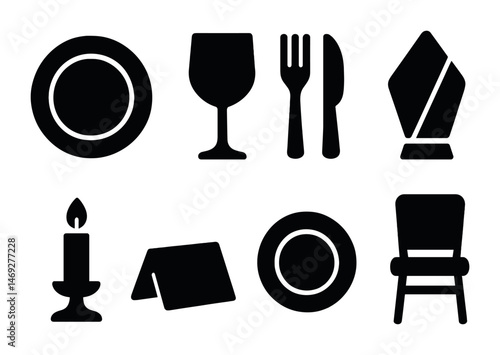 Dining icons set featuring tableware and utensils in minimalistic silhouette style