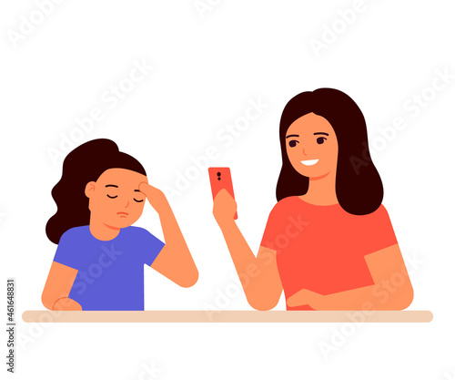 Interested mother make photo child girl on smartphone. Sad daughter against attention to herself. Vector illustration