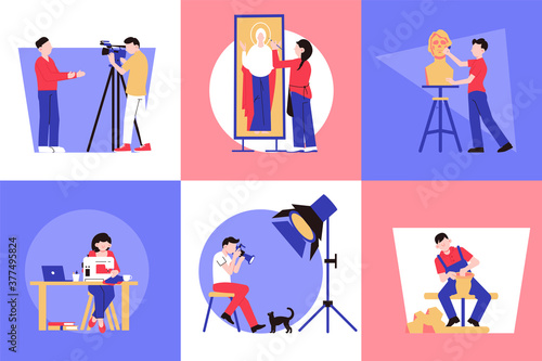 Video production concept. Making visual content for social media. Writing scenario, shooting video and editing with special equipment. Multimedia and film production concept. Vector illustration.