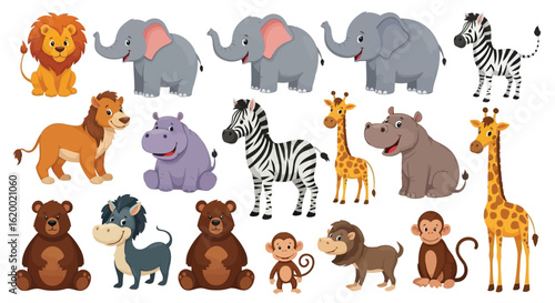 Cute jungle animals. Cartoon African wild mammals. Funny lion, zebra, happy elephant, monkey, nice hippo, toucan and parrot birds. Kids safari animal. Vector set