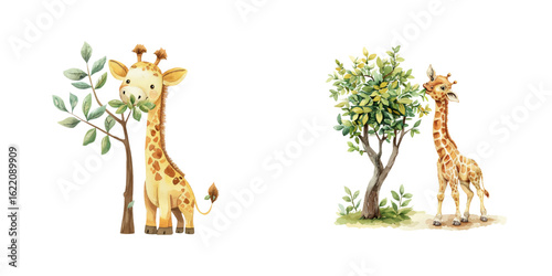 Watercolor Illustration Set of Safari Animals and Tropical Leaves