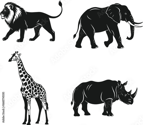 Silhouette illustrations of various wild animals, including a lion, deer, and elephant, on a plain background.