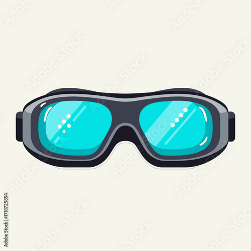 Illustration of goggles with blue lenses and a black frame on a light background.
