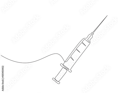Continuous one line drawing of syringe for inject. One line drawing illustration of medical syringe. Medical health, vaccine vial, anti virus concept single line. Editable outline