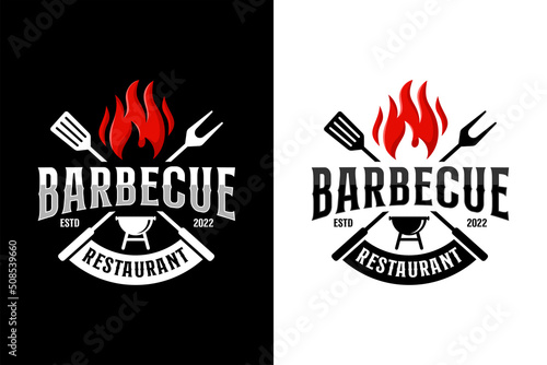 BBQ barbecue logo design vintage flame fire grill spatula carving fork icon symbol restaurant illustration