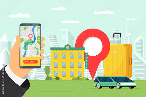 Phone with interface taxi on screen on background the city. Mobile app for booking service. Flat vector illustration for business, info graphic, banner, presentations