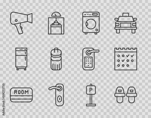 Set line Hotel key card, slippers, Washer, Door handle, Hair dryer, Trash can, Parking and booking calendar icon. Vector