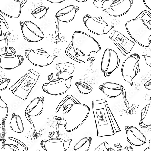 Vector seamless black and white pattern sketch illustration tea brew procedure icons. Tea making instruction. Guidelines how to make hot aromatic drink. Teapot and boil in the kettle water.