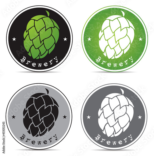 Hop beer logo or brew emblem with hops and metal cap for bar or pub. Craft print or label with cork and plant for brewery shop