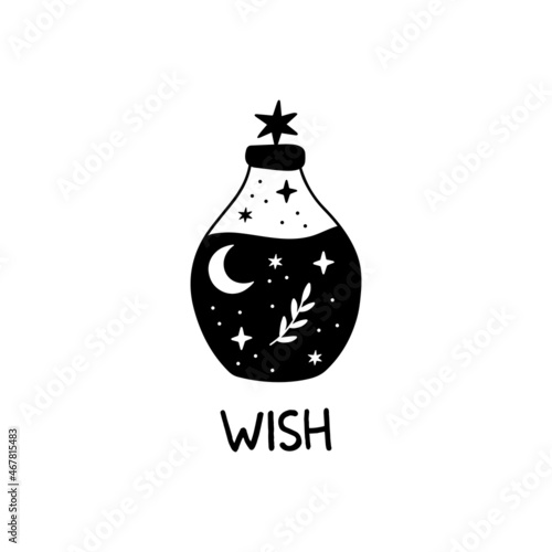 Bottle silhouette with magic elixir or poison. Mystic jar vector illustration. Esoteric alchemy design element. Witch brew poster with moon, stars. Hand drawn witchcraft symbol isolated on white.