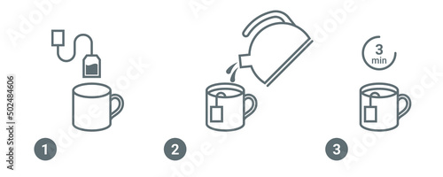 Instruction How to Brewing Tea Bag. Place Tea Bag in Cup, Add Boiling Water, Wait for few Minutes. Cooking Direction for Hot Drink. Flat Line Vector Illustration and Icons set.
