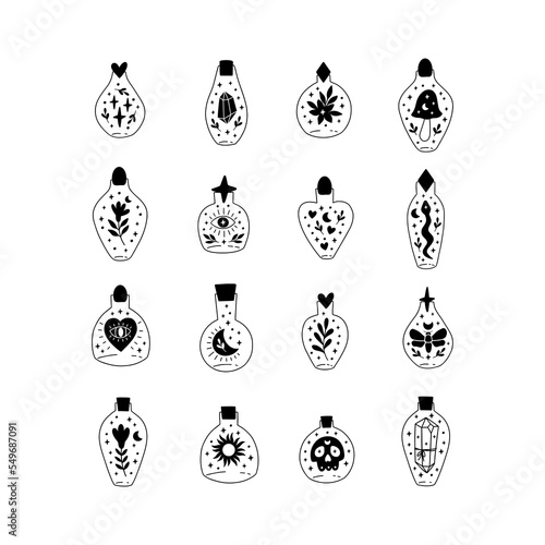 Potion bottle vector collection. Witches brew with celestial elements illustration. Mystical elixir or poison icons. Alchemy symbol, magic jar clipart with moon, skull, mushroom, snake, crystal.