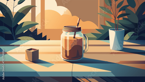 A quiet peaceful scene in a garden where a glass mason jar filled with cold water and coffee grounds is sitting on a bistro table. Soft