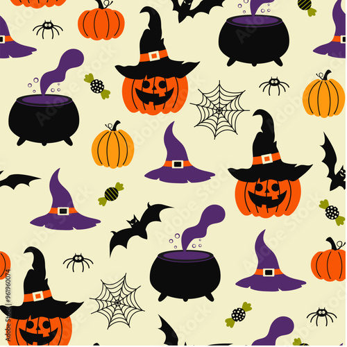 Halloween seamless pattern. Vector illustration of Halloween party. Cute bat, spider web, witches brew, pumpkin in a hat and candy on a light background. Holiday cartoon seamless pattern.