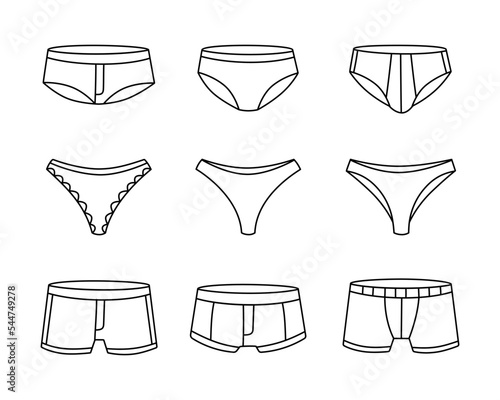 Men's underwear types, boxer shorts, briefs, boxer briefs, black line sketch, fashion garment, cad drawing flat vector illustration