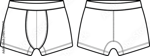 Men’s boxer briefs front and back view, CAD drawing, flat vector illustration, underwear template, fitted apparel design, casual clothing sketch, editable garment