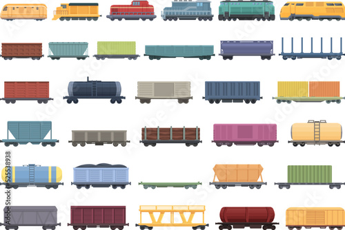 A set of railway locomotive and wagons. View from above. Isolated on white background. Vector illustration.