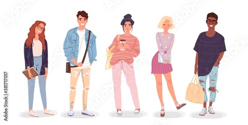 Student group standing together. Young people with backpacks and books. Diverse college classmates in casual clothes. Youth lifestyle concept