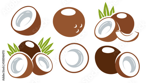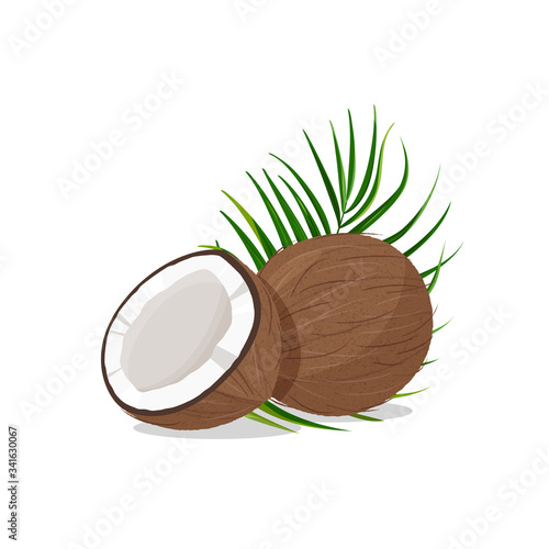 Whole Coconut, half and pieces of coconut with green palm leaf. Tropical fruit vector illustration