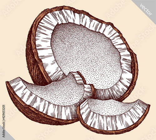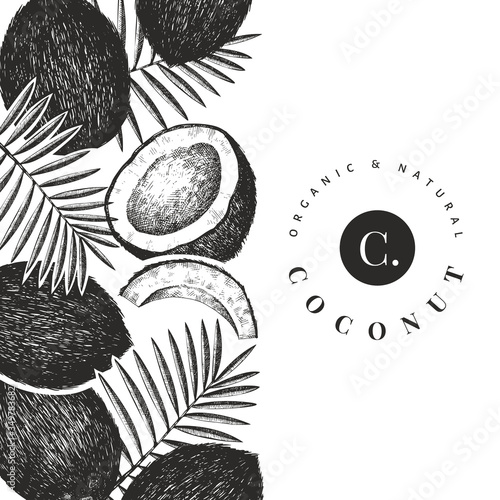 Hand drawn coconut design template. Retro sketch style vector tropical food illustration.
