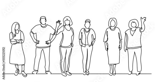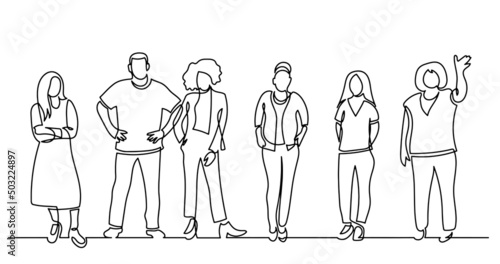 Continuous line drawing of diverse group of standing people. continuous line drawing of group of various positive diverse people standing in a row