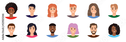 Set of different people avatars vector flat illustration. Collection of diverse man and woman portraits isolated on white. Smiling colorful young and adult person. Bundle of multiethnic user avatar