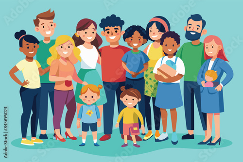 A cheerful cartoon illustration depicting a group of diverse people, including adults and children, smiling and standing together in a friendly and inclusive way.