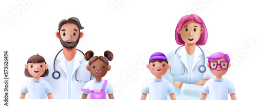 3D pediatrician, family doctor children healthcare concept, vector medical female male character. Cartoon therapist, boys girls smiling patients, hospital cheerful man volunteer. Pediatrician doctor