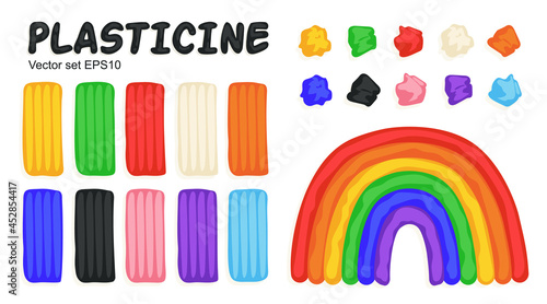 Kids modeling clay, colorful plasticine set with bricks, pieces and rainbow. Art process, creative workshop. Hand drawn illustration in modern cartoon flat style.