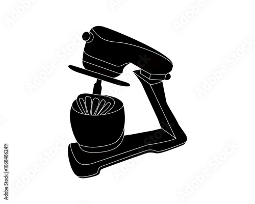 Planetary dough mixing machine, planetary mixer. Kitchen appliances. Vector black and white illustration